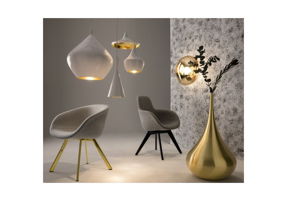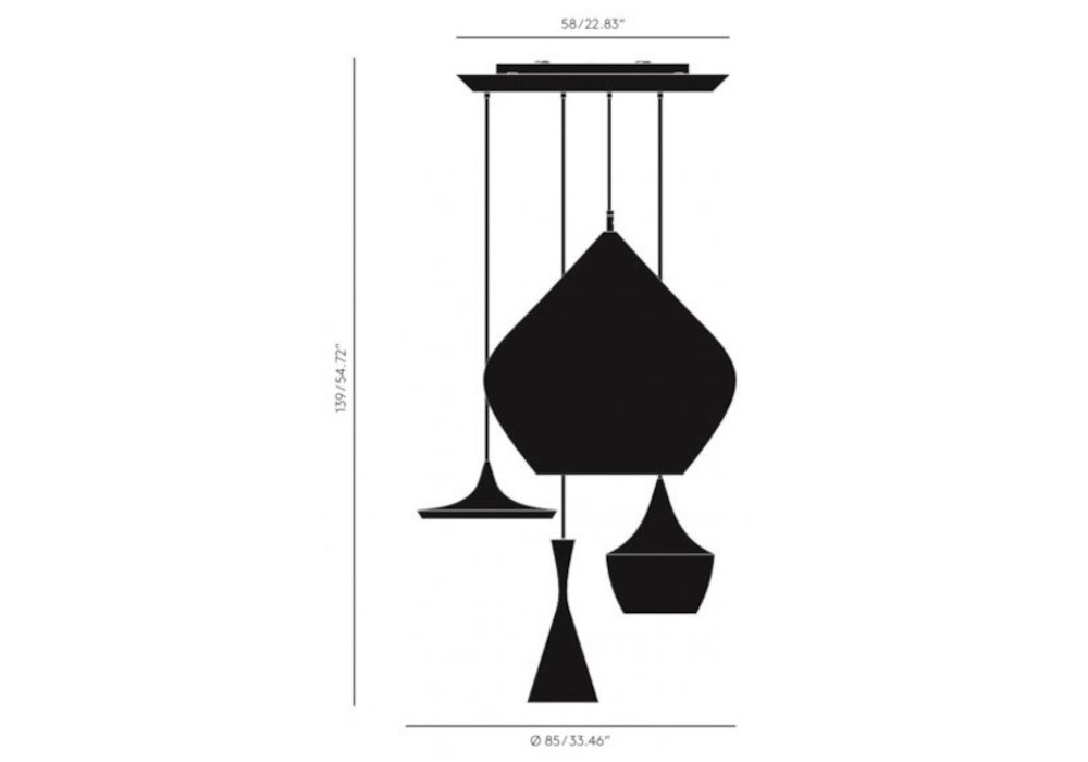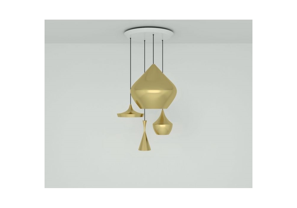 Beat Range Round diseñado por Tom Dixon es un sistema de suspensión compuesto por cuatro lámparas de latón. Sistema disponible en diferentes acabados.