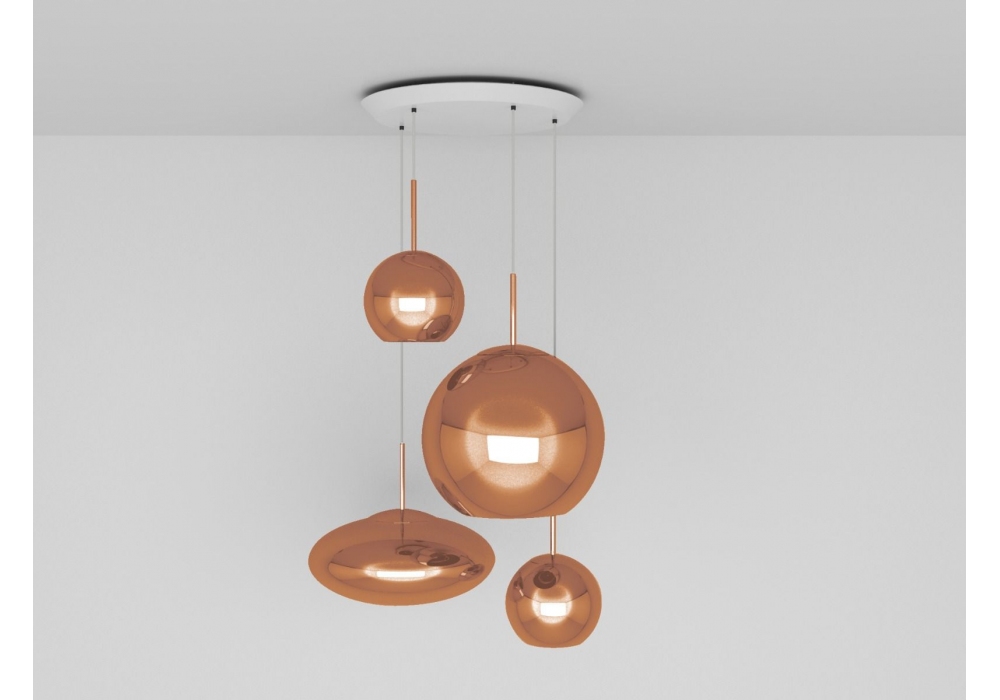 Copper Range Round diseñado por Tom Dixon es un sistema de suspensión compuesto por cuatro lámparas de cobre.