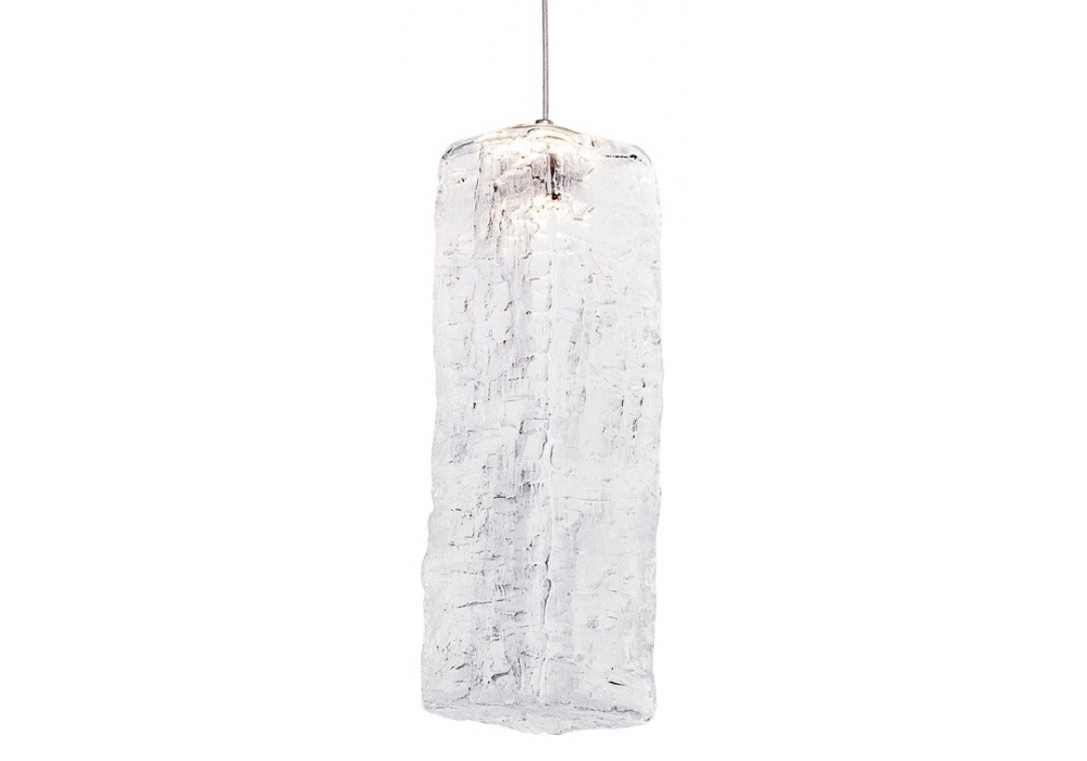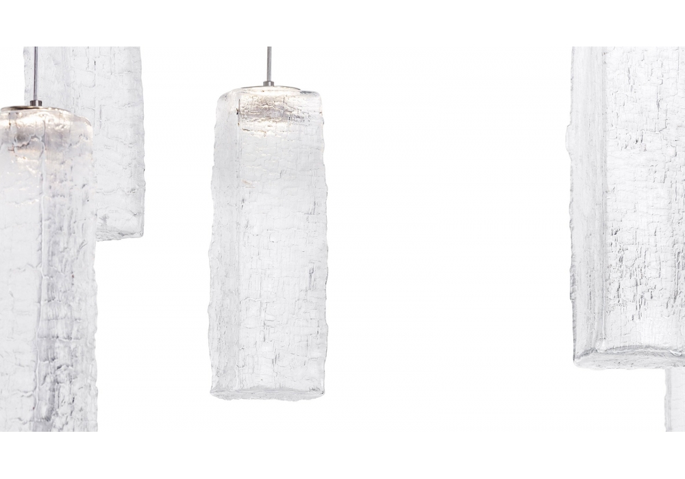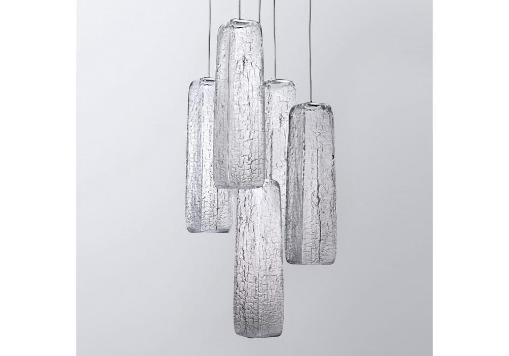 Yakisugi diseñada por Kengo Kuma para Lasvit es una lámpara de suspensión de vidrio. La colección Yakisugi se inspira en la antigua técnica japonesa para preservar la madera de construcción carbonizando su superficie. Usando madera seca en lugar de los moldes tradicionales previamente empapados, la madera es carbonizada por el vidrio fundido. Eso deja una huella permanente de su textura quemada en la superficie de cristal, haciendo cada pedazo un original auténtico.