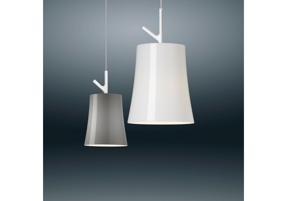 Birdie diseñada por Ludovica y Roberto Palomba para Foscarini es una lámpara de suspensión con estructura portante en metal pintado de blanco. La pantalla está estructurada en policarbonato cilíndrico y alberga una fuente de luz retrofit LED o halógena con casquillo E27. Birdie está disponible en diferentes modelos y acabados.