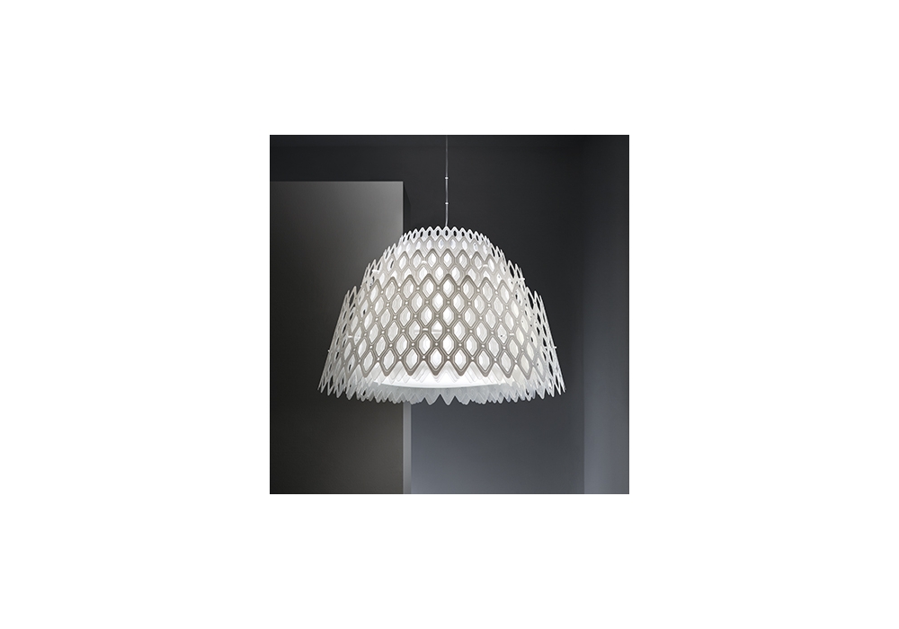 Half Charlotte diseñada por Doriana y Massimiliano Fuksas para Slamp es una lámpara de suspensión de forma circular con círculos concéntricos, completamente estructurada en Cristlaflex y Lentiflex blancos. Las fuentes de luz adoptadas son del tipo LED de filamento regulable.