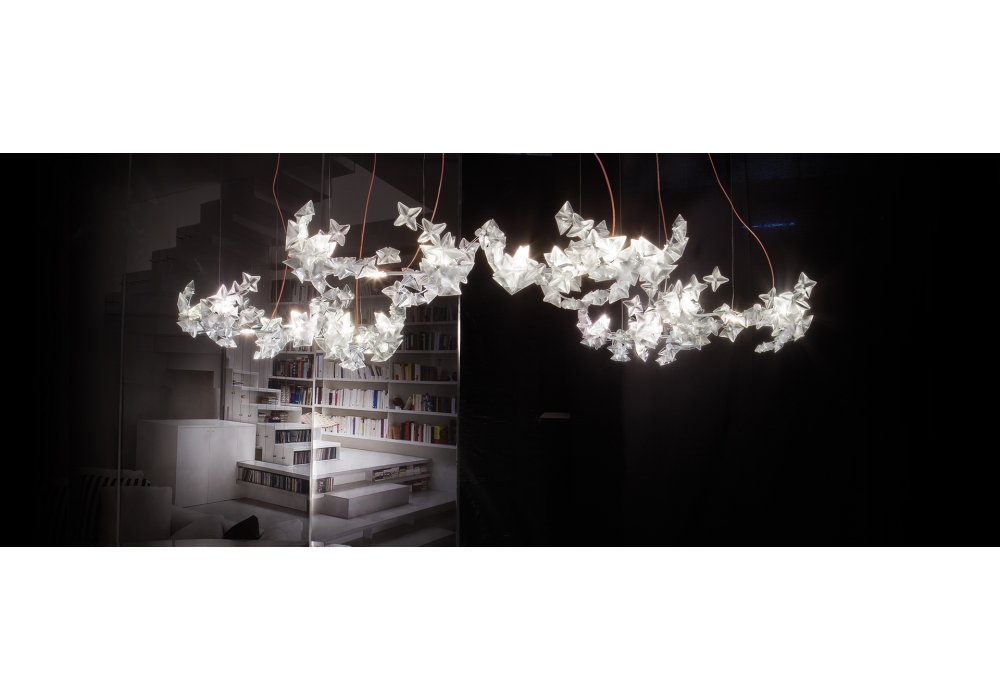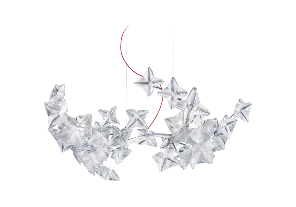 Hanami diseñada por Adriano Rachele para Slamp es una lámpara de suspensión realizada íntegramente en Lentiflex, policarbonato y acero inoxidable. La fuente de luz utilizada es de tipo LED regulable con cable de alimentación rojo o transparente. Hanami está disponible en diferentes tamaños.