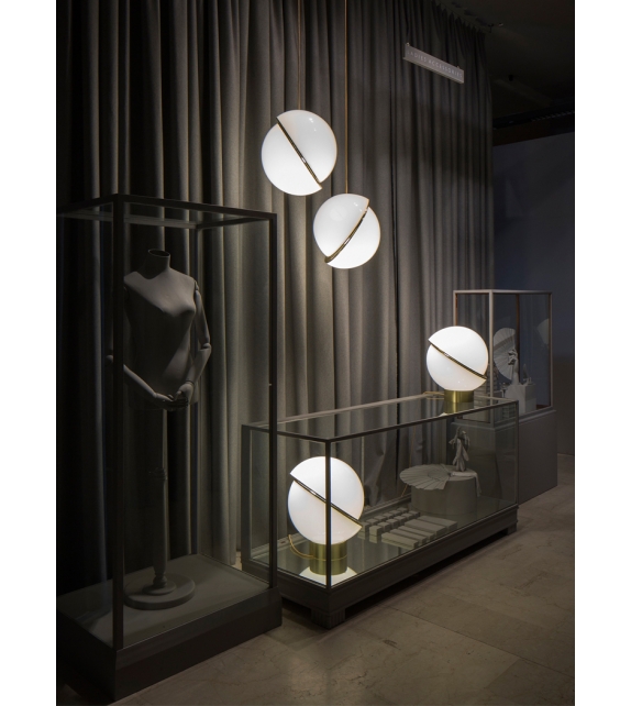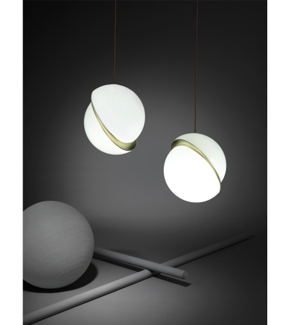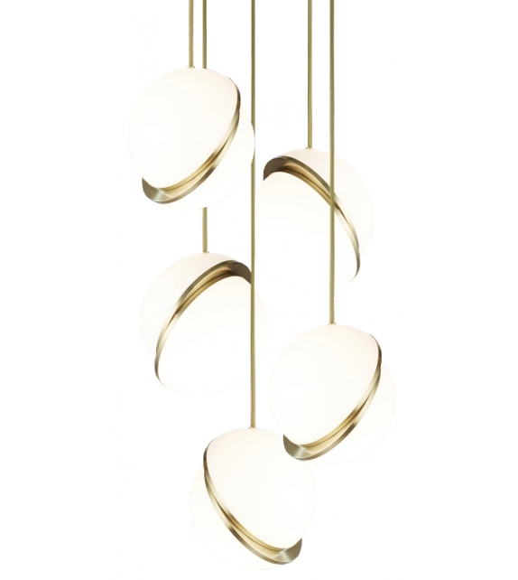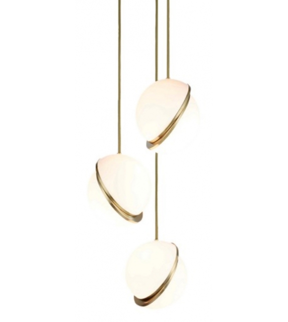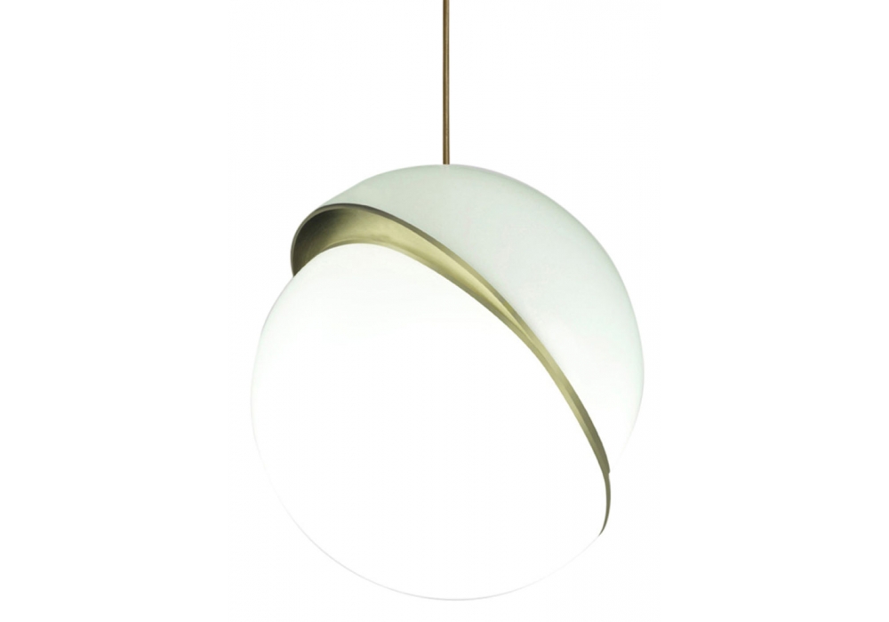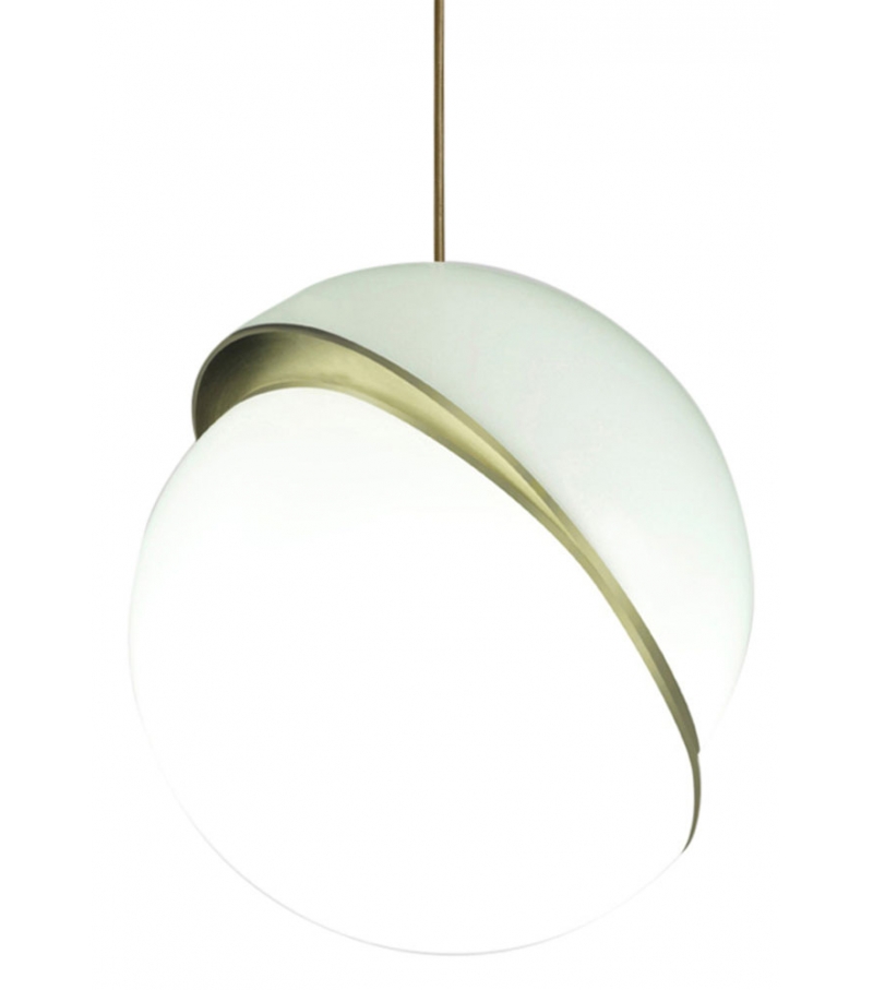 Crescent Light diseñada por Lee Broom es una lámpara de suspensión en acrílico opaco y latón cepillado. Con una esfera iluminada cortada por la mitad para revelar una fascia de latón en forma de media luna, Crescent Light combina el sólido y el opaco. Cable de tela de oro de 300 cm. Rosetón de latón cepillado de 12 cm redondos.
