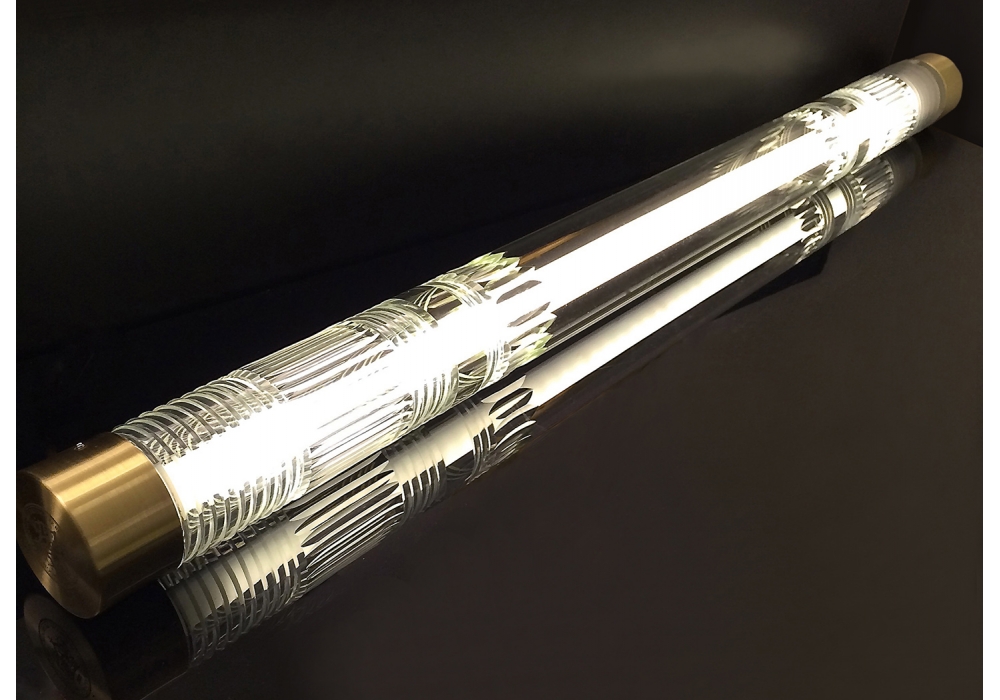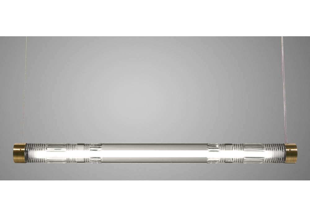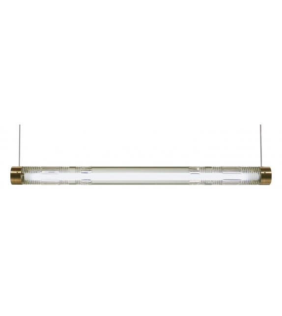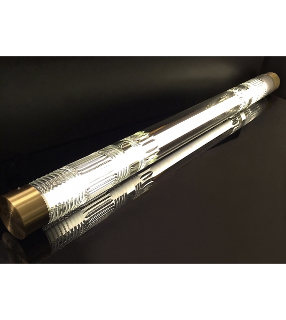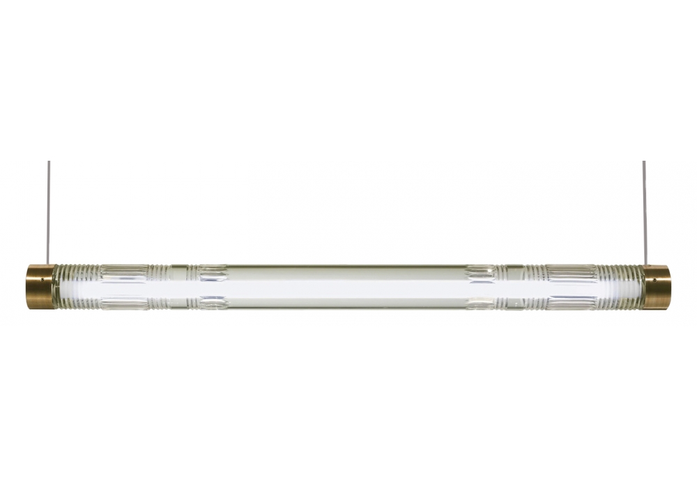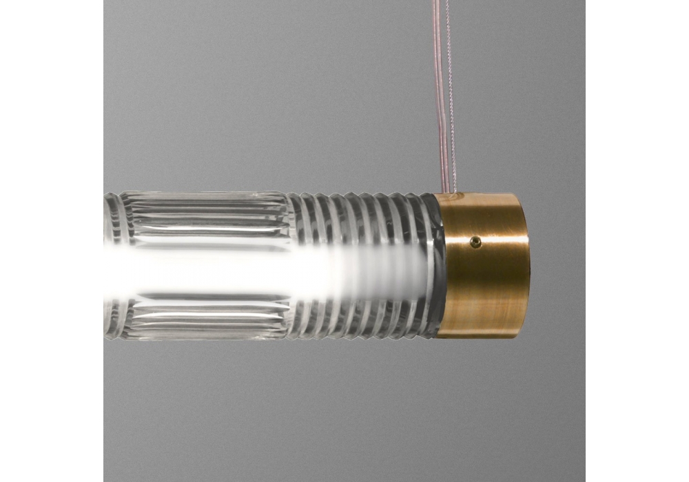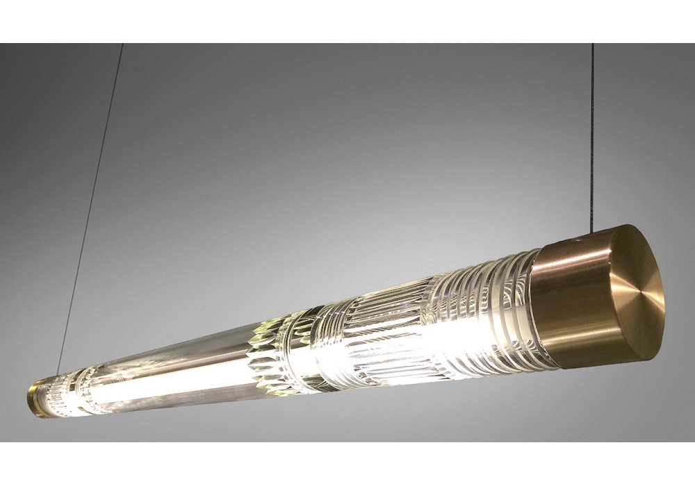 Crystal Tube Light diseñada por Lee Broom es una lámpara de suspensión en cristal y latón cepillado o cromo pulido. La longitud del cristal de plomo cortado a mano envuelve una fuente de luz LED, dando como resultado un haz de luz brillante y brillante en el tubo fluorescente. 2 Rosetones de latón cepillado de 12 cm redondos.