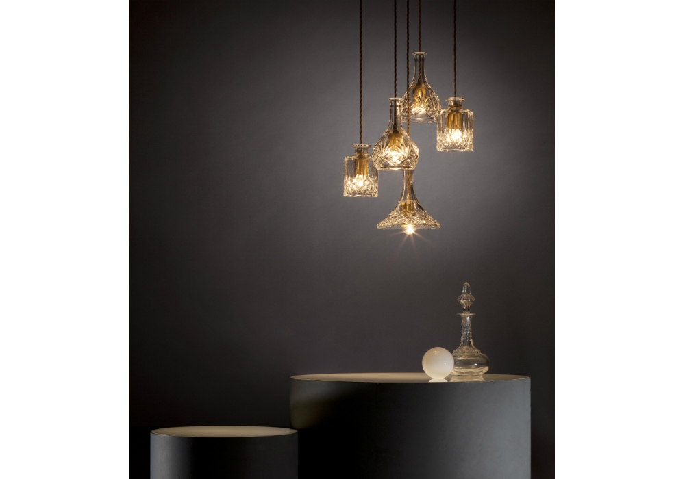 Square Decanterlight diseñada por Lee Broom es una lámpara de suspensión realizada con cristal de plomo cortado a mano y latón cepillado. Incluye un cable de 300 cm de tejido de oro con un rosetón en latón cepillado de 12 cm.