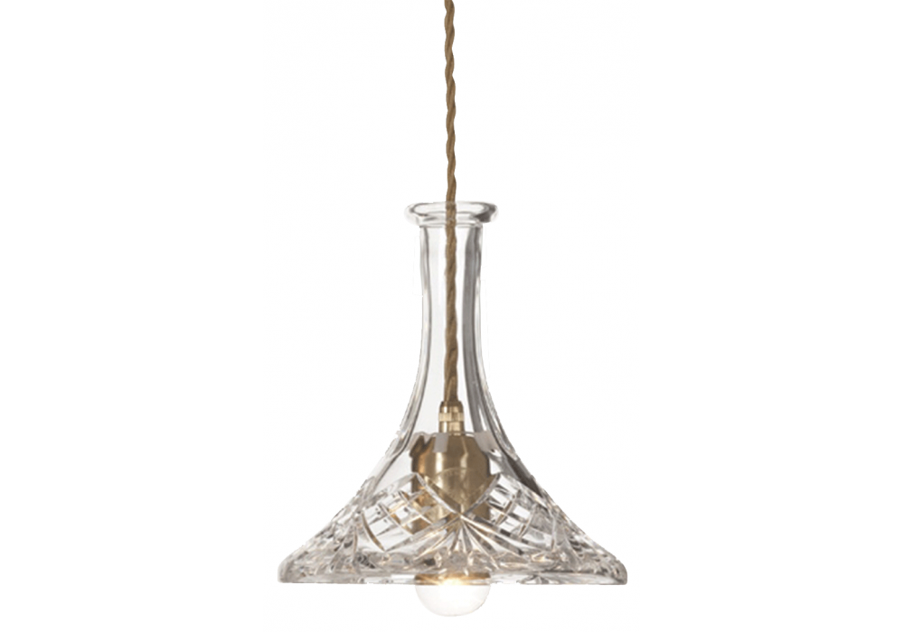 Tulip Decanterlight diseñada por Lee Broom es una lámpara de suspensión realizada con cristal de plomo cortado a mano y latón cepillado. Incluye un cable de 300 cm de tejido de oro con un rosetón en latón cepillado de 12 cm.