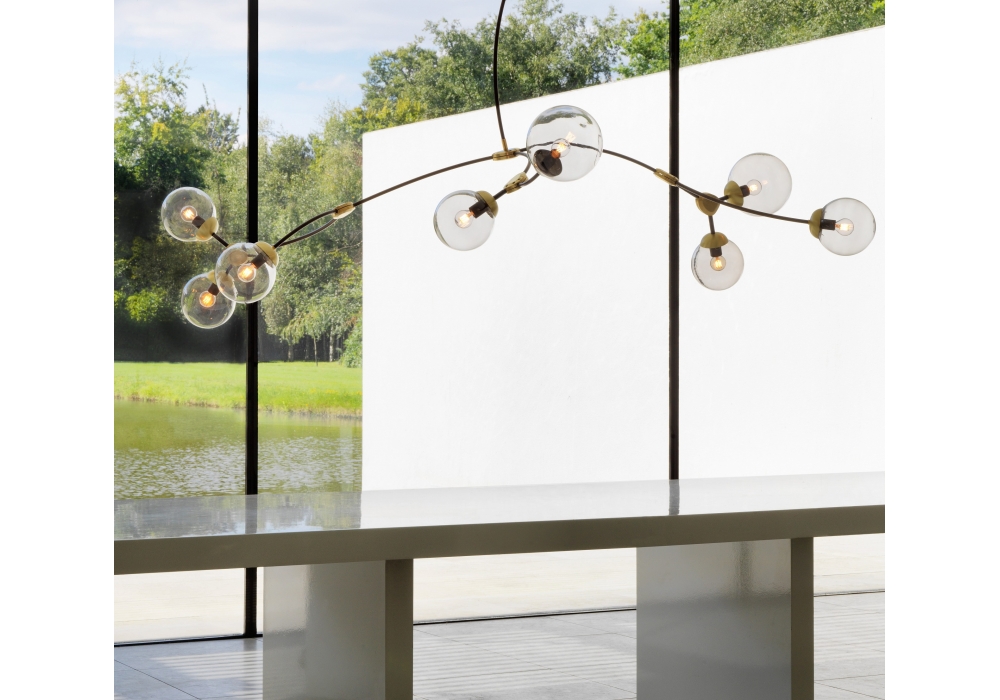 Ivy 8 diseñada por CTO Lighting es una lámpara de suspensión realizada en bronce con detalles en latón satinado. Difusores en cristal opal o ahumado.