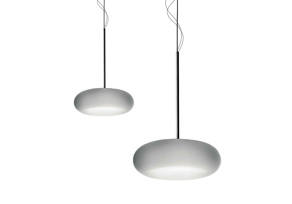 Itka diseñada por Naoto Fukasawa para Artemide es una lámpara de suspensión con estructura portante en acero pintado. El difusor está fabricado en vidrio opalino soplado y protege una fuente de luz LED. Itka está disponible en tallas.