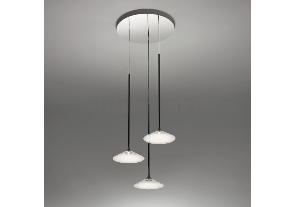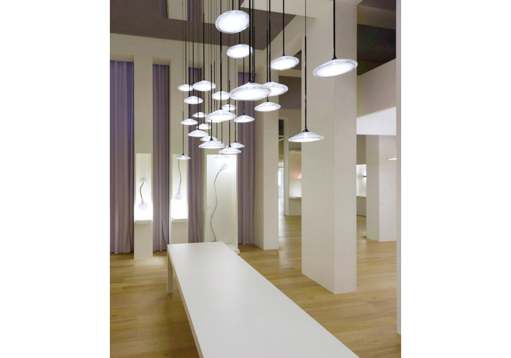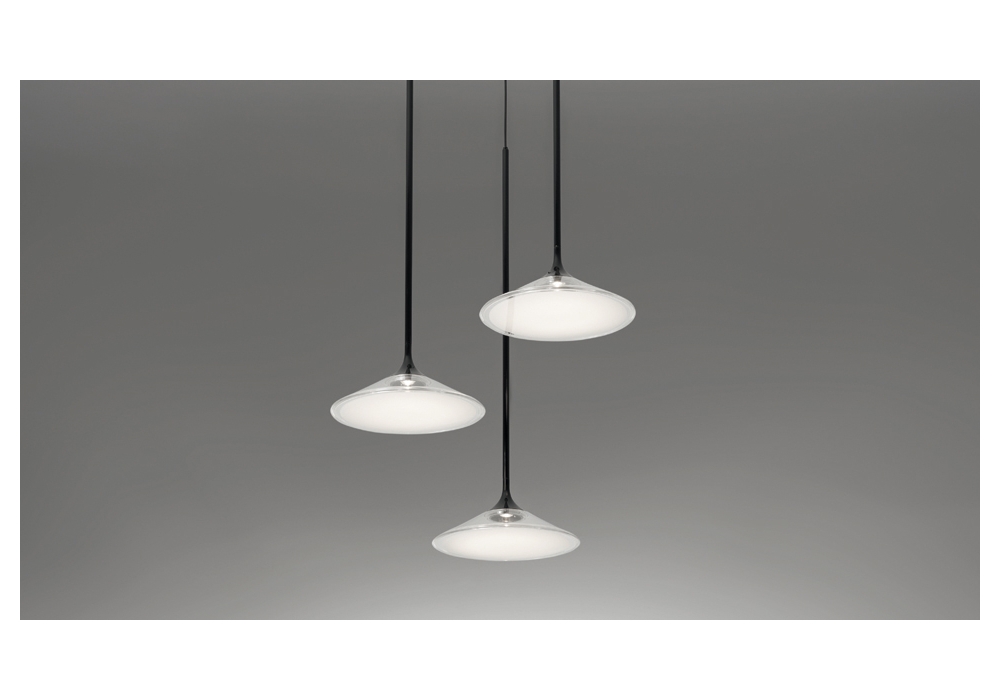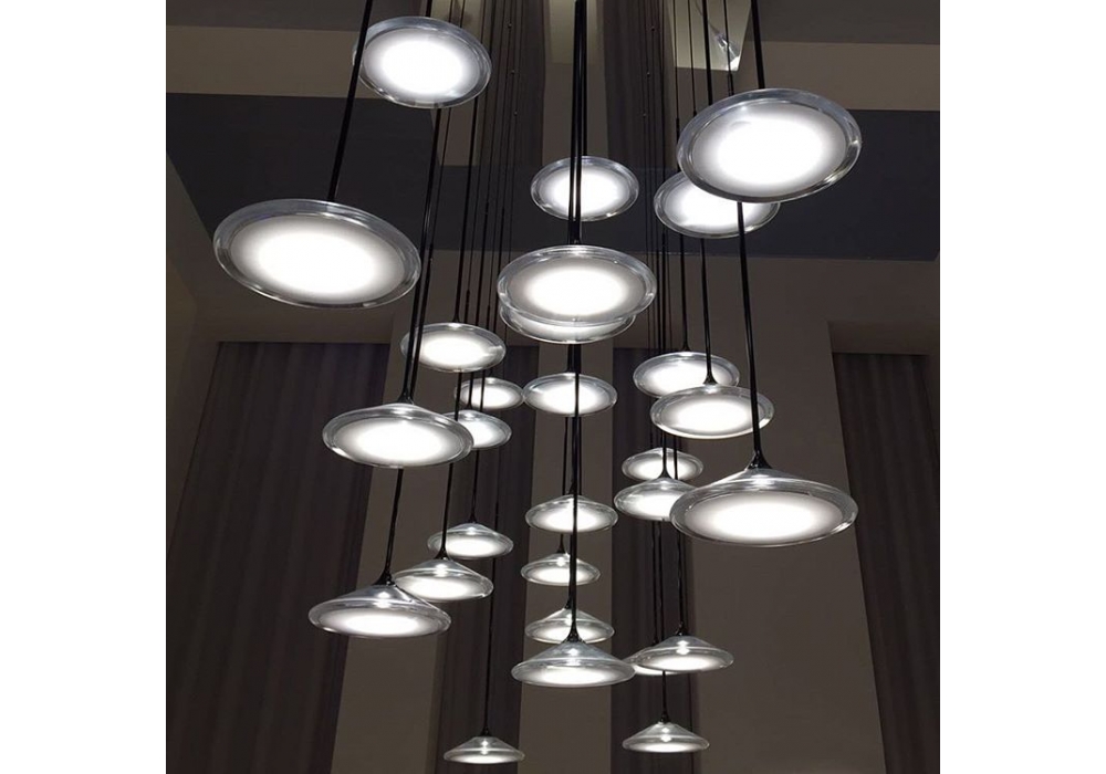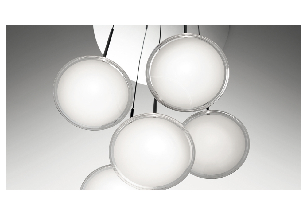 Orsa Cluster diseñada por Foster + Partners para Artemide es una lámpara de suspensión con rosetón cromado y estructura portante en aluminio pintado negro y latón. Los difusores tienen forma circular transparente y adoptan fuentes de luz LED regulables.