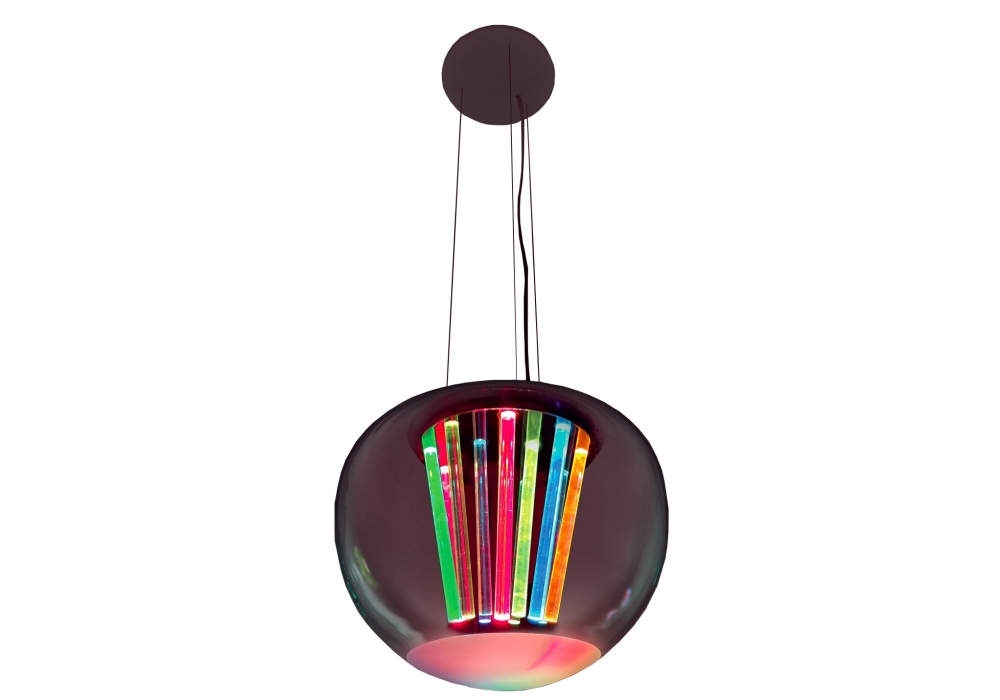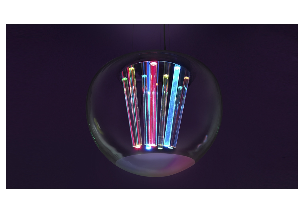 Spectral Light diseñada por Philippe Rahm para Artemide es una lámpara de suspensión con estructura portante en metal cromado y difusor esférico en vidrio soplado transparente. La fuente de luz adoptada es de tipo LED con sistema de regulación Push.