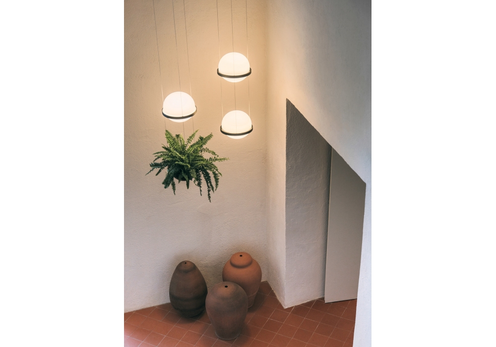 Palma diseñada por Antoni Arola para Vibia es una lámpara de suspensión con perfil de aluminio pintado anclada a dos tirantes. El difusor tiene forma esférica y está fabricado en vidrio soplado y protege una o más fuentes de luz LED regulables. Palma está disponible en diferentes acabados, modelos y versiones de control de iluminación.