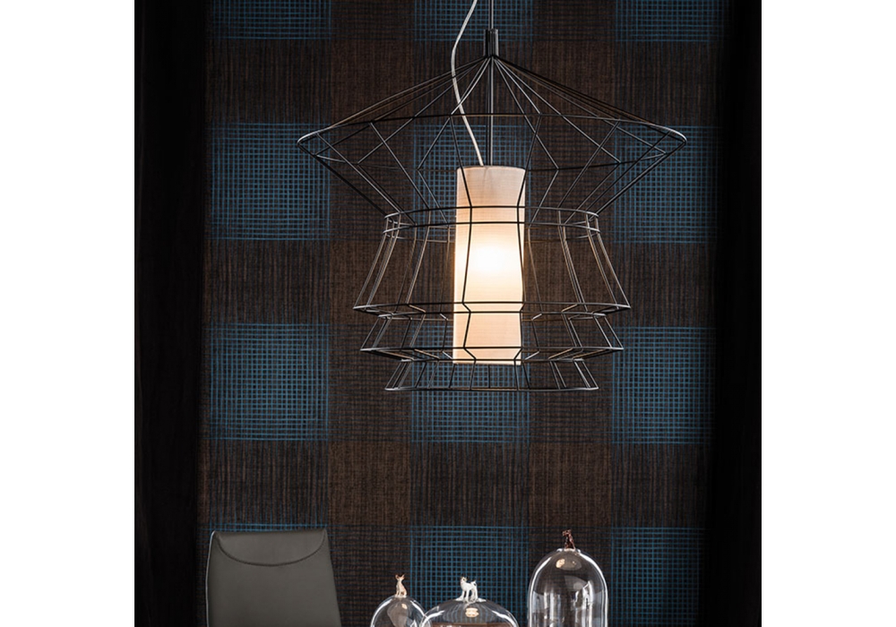 Zeppelin diseñada por Oriano Favaretto para Cattelan Italia es una lámpara de suspensión con estructura en níquel o acero barnizado negro mate. Pantalla en tejido disponible en marfil, marrón o negro. Disponible en dos dimensiones y en versiones de 220V o 110V. Es posible integrar un cable adicional de 1 mt. Bombilla no incluida.