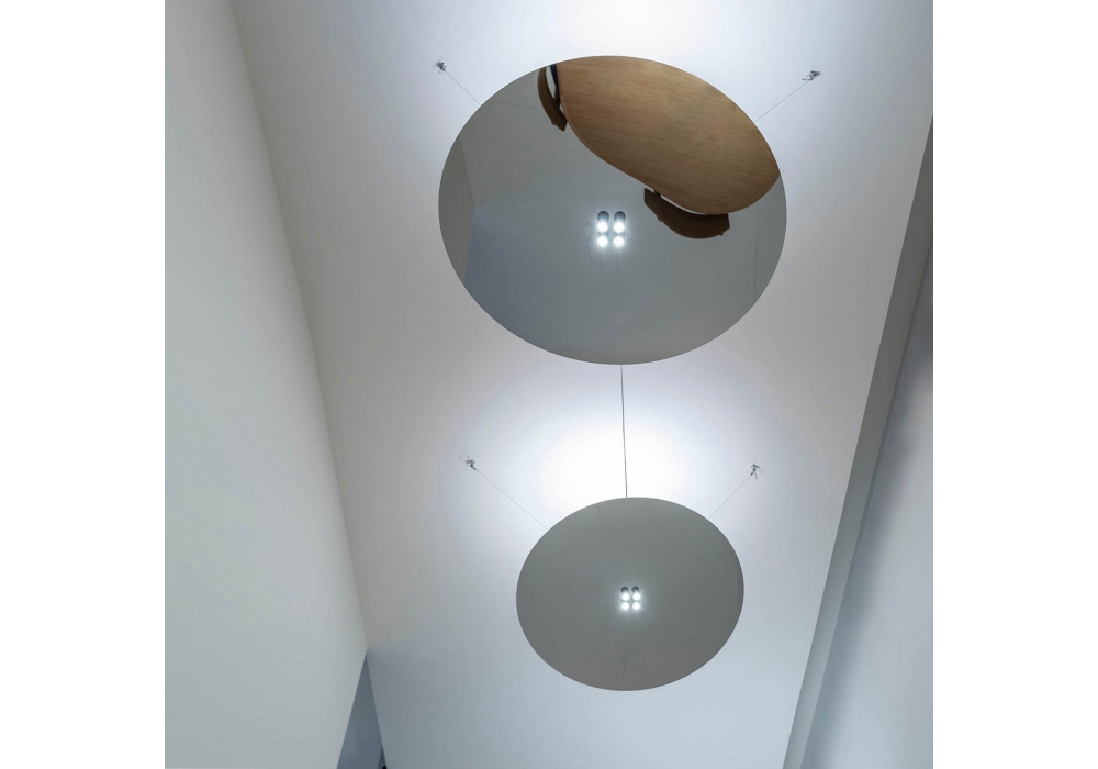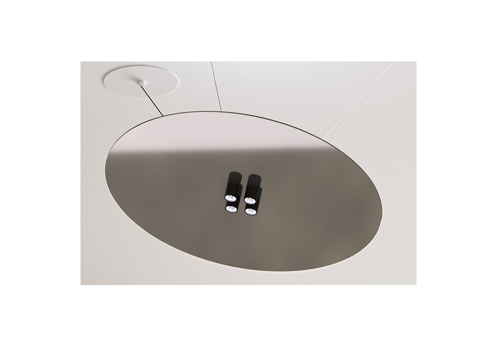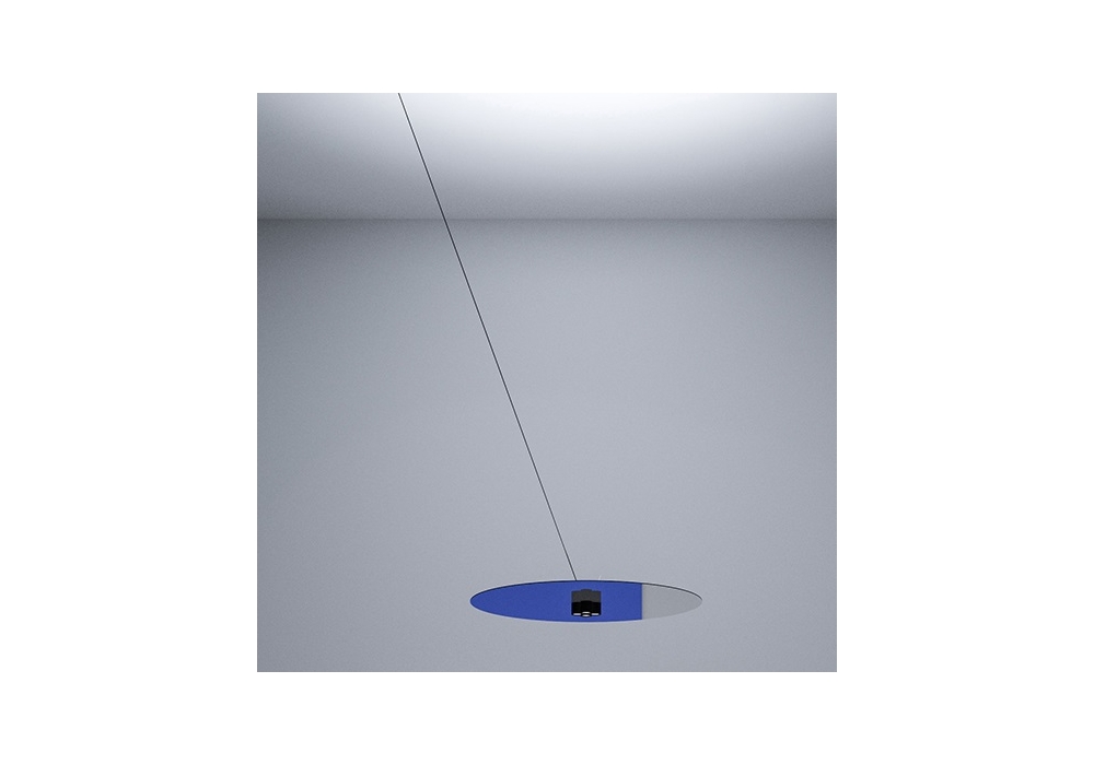 Cartesio diseñada y producida por Davide Groppi es una lámpara de suspensión circular sostenida por varillas de acero. El difusor es de acero inoxidable con acabado de espejo y utiliza fuentes de luz LED de doble emisión. Cartesio está disponible en diferentes tamaños.