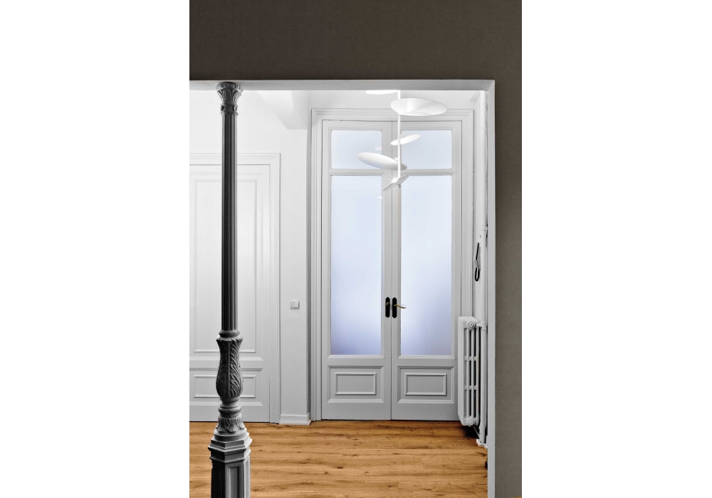 Obs diseñada por Estudi Ribaudí para Estiluz es una lámpara de suspensión completamente estructurada en metal. Los difusores se pueden orientar 340° y utilizan una fuente de luz LED con un sistema de atenuación triac. Obs está disponible en diferentes acabados.