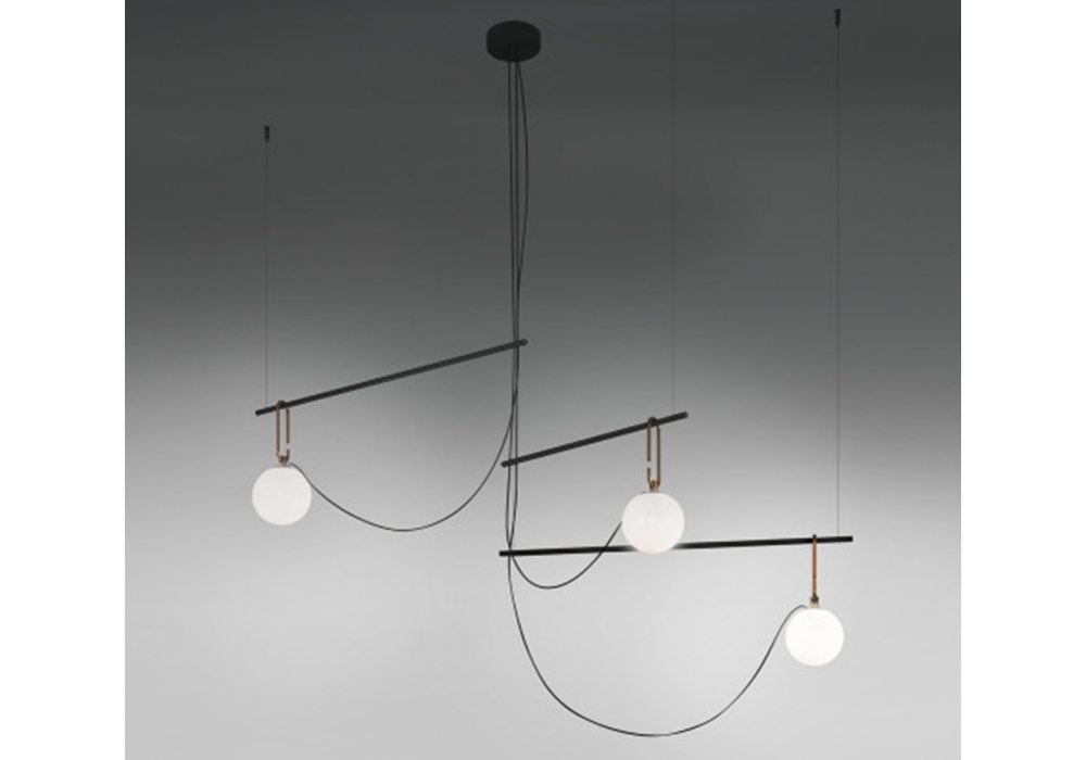 NH S3 14 diseñada por Neri&Hu para Artemide es una lámpara de suspensión con estructura en tubo de acero y elementos de suspensión de latón. Los tres difusores esféricos están fabricados en vidrio soplado blanco y adoptan fuentes de luz LED regulables.