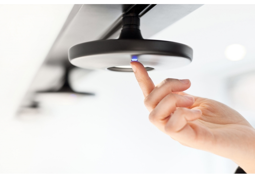 Button diseñada por Francesc Rifé para Estiluz es una lámpara de riel de suspensión con una estructura portante cuadrangular en aluminio pintado. Los difusores son de forma circular en aluminio y adoptan una fuente de luz tipo LED con sensor de atenuación táctil. Buttom está disponible en diferentes acabados y modelos.