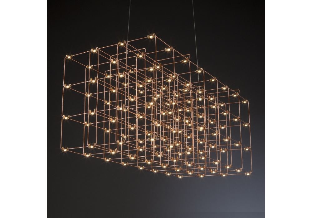 Cosmos Square diseñada por Jan Pauwels para Quasar es una lámpara de suspensión con rosetón negro y cuerpo cuadrangular estructurado por una serie de varillas tubulares ancladas entre sí. Las fuentes de luz fijadas a la estructura portante son del tipo LED. Cosmos está disponible en diferentes modelos y acabados.