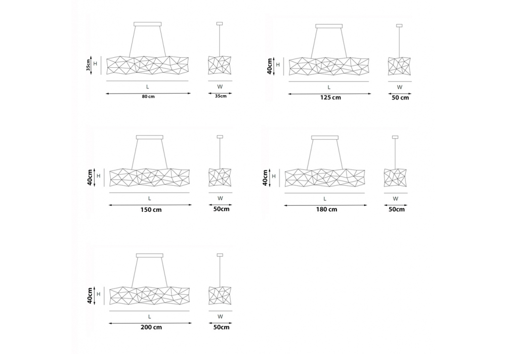 | Dimensiones | L 80 x W 35 x H 35 cm; L 125 x W 50 x H 40 cm; L 150 x W 50 x H 40 cm; L 180 x W 50 x H 40 cm; L 200 x W 50 x H 40 cm |