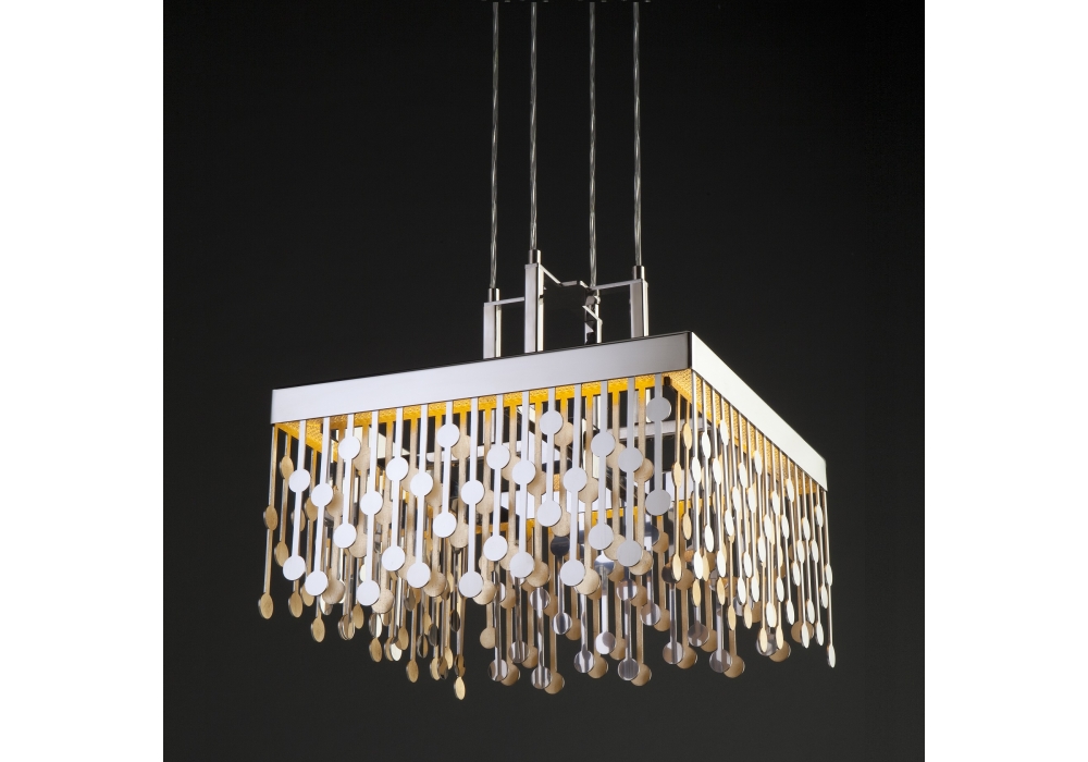 Melody diseñada por Sybille Van Gammeren para Quasar es una lámpara de suspensión con estructura portante y cuerpo de lámpara en acero inoxidable pulido, con aplicaciones decorativas en pan de oro. La fuente de luz adoptada es de tipo LED integrada.