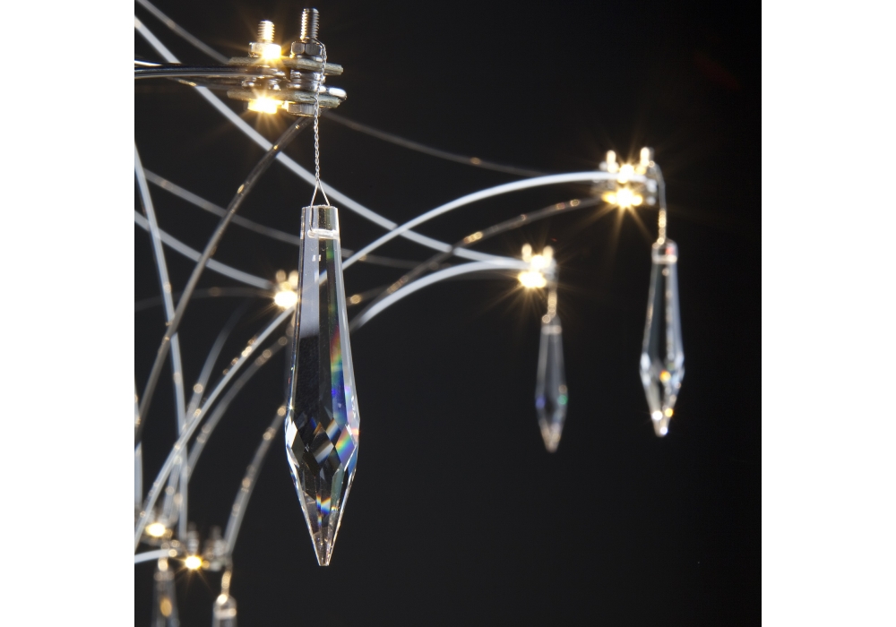 Mira diseñada por Jan Pauwels para Quasar es una lámpara de suspensión con estructura de metal pintado y colgantes decorativos de cristal Swarovski. Las fuentes de luz adoptadas son de tipo LED. Mira está disponible en diferentes medidas y acabados.
