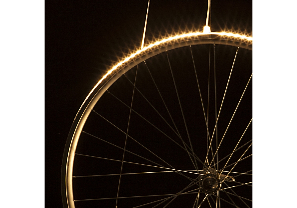 Eddy, diseñado por Fabio Antinori para Cyclampa, es una lámpara de suspensión de aluminio. La lámpara se compone de rueda de aluminio fundido, componente original de la bicicleta. Ledstrip de alta capacidad, equipado con chip de control térmico integrado. Fijación al techo con 3 cables de acero, regulables en altura, anclados a un pasador de aluminio pintado, con el conductor Ledstrip a bordo.