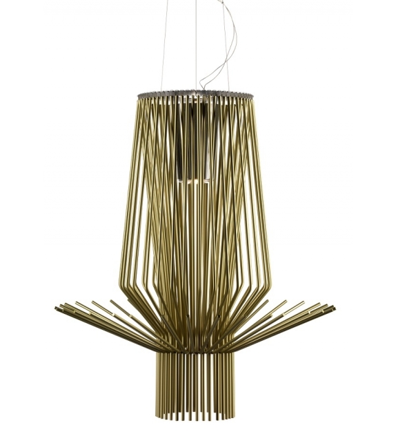 Allegretto Assai diseñada por Atelier Oï para Foscarini es una lámpara de suspensión estructurada en aluminio pintado oro y metal cromado. La fuente de luz adoptada es con casquillo E27.