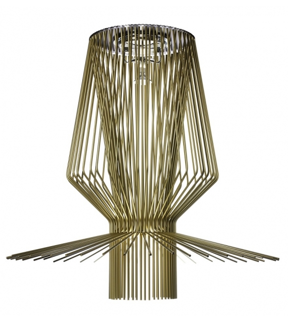 Allegro Assai diseñada por Atelier Oï para Foscarini es una lámpara de suspensión estructurada por varillas cuidadosamente dobladas en aluminio pintado oro y metal cromado. La fuente de luz utilizada es del tipo LED regulable o halógena.