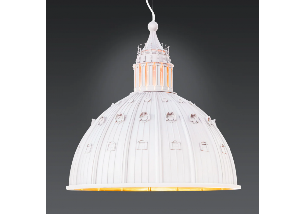 Cupolone diseñada por AMeBe para Seletti es una lámpara de suspensión. Realizada en dos acabados (resina blanca o gris) es una reproducción de la cúpula de San Pietro.