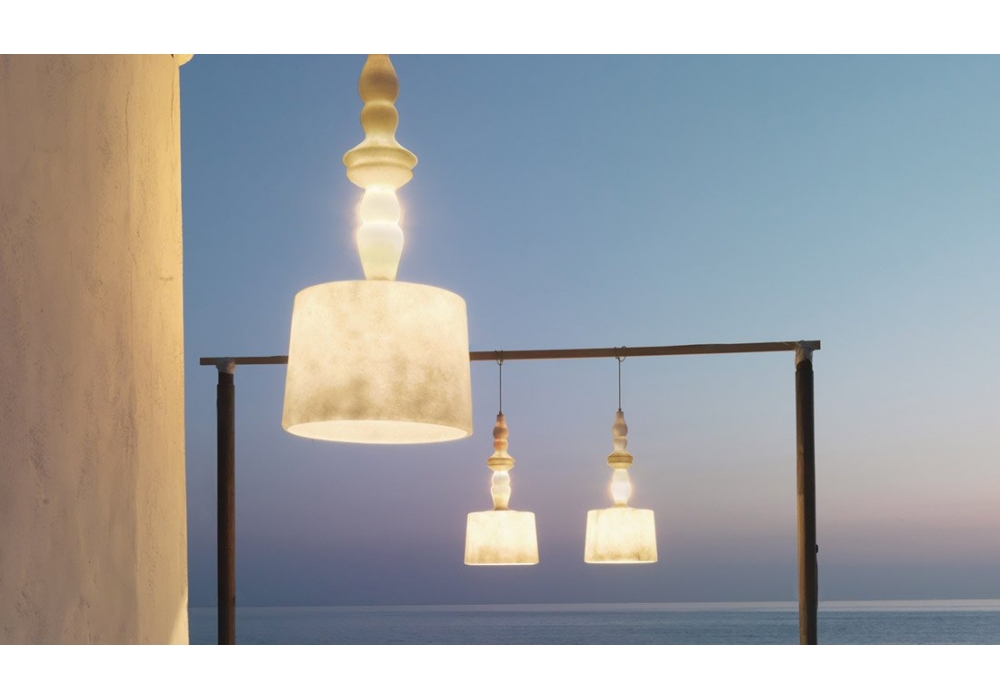 Alibabig diseñada por Matteo Ugolini para Karman es una lámpara de suspensión en fibra de vidrio blanca con rosetón de metal blanco brillante.