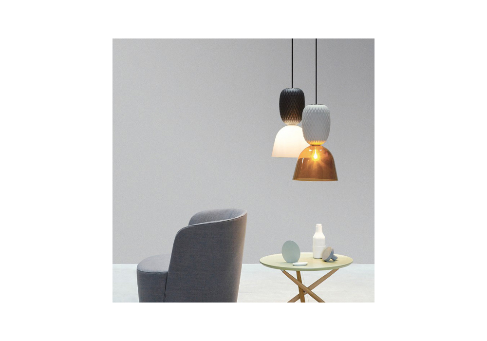 Pineapple 7214/1 diseñada por Matteo Zorzenoni para MMLampadari es una lámpara de suspensión con pantalla de vidrio pulido y estructura cerámica, disponible en cinco combinaciones de colores.