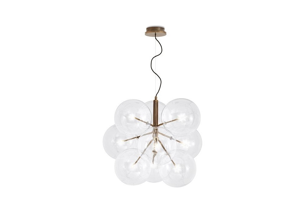 Bolle Cielo diseñada por Massimo Castagna para Gallotti&Radice es una lámpara de suspensión con estructura de latón bruñido, disponible con 6 o 9 esferas de cristal transparente.