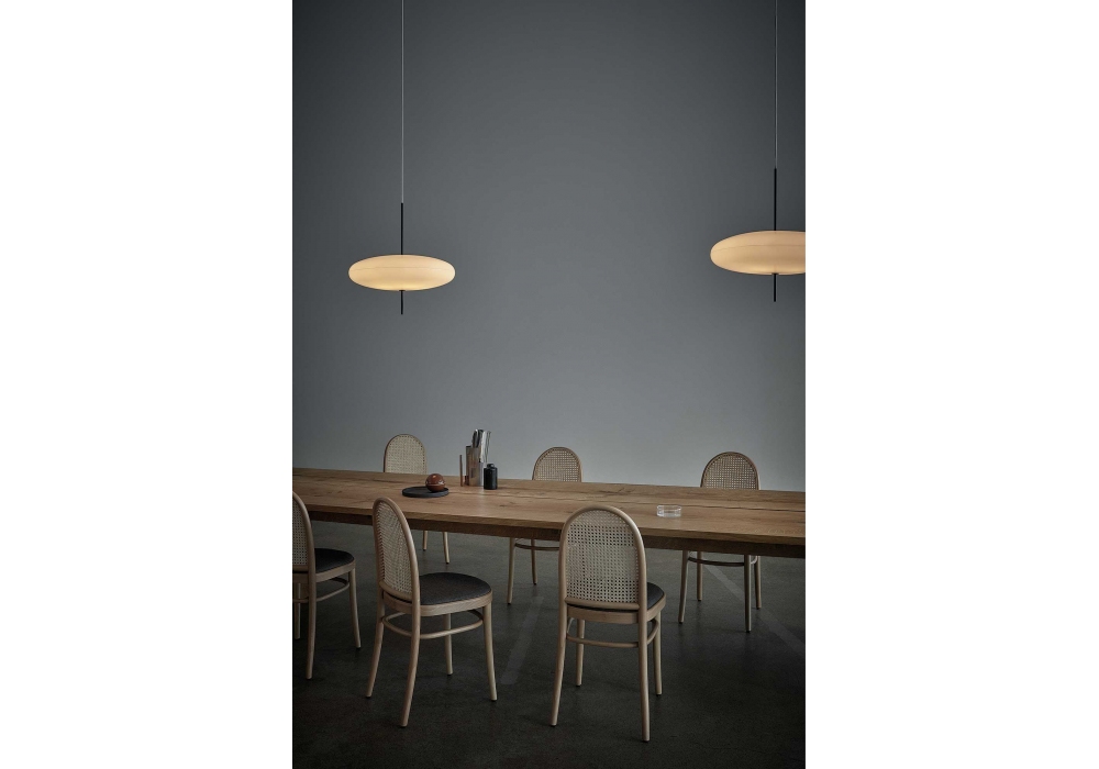Model 2065 diseñada por Gino Sarfatti para Astep es una lámpara de suspensión con difusor de metacrilato opal y estructura de aluminio, disponible en diferentes acabados.