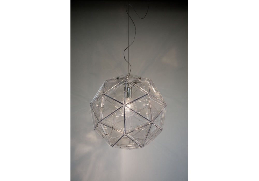 Poliedro diseñada por Elio Martinelli para Martinelli Luce es una lámpara de suspensión con estructura en metal cromado. El difusor es de metacrilato estructurado por múltiples elementos anclados entre sí, y apantalla una fuente de luz de tipo LED.