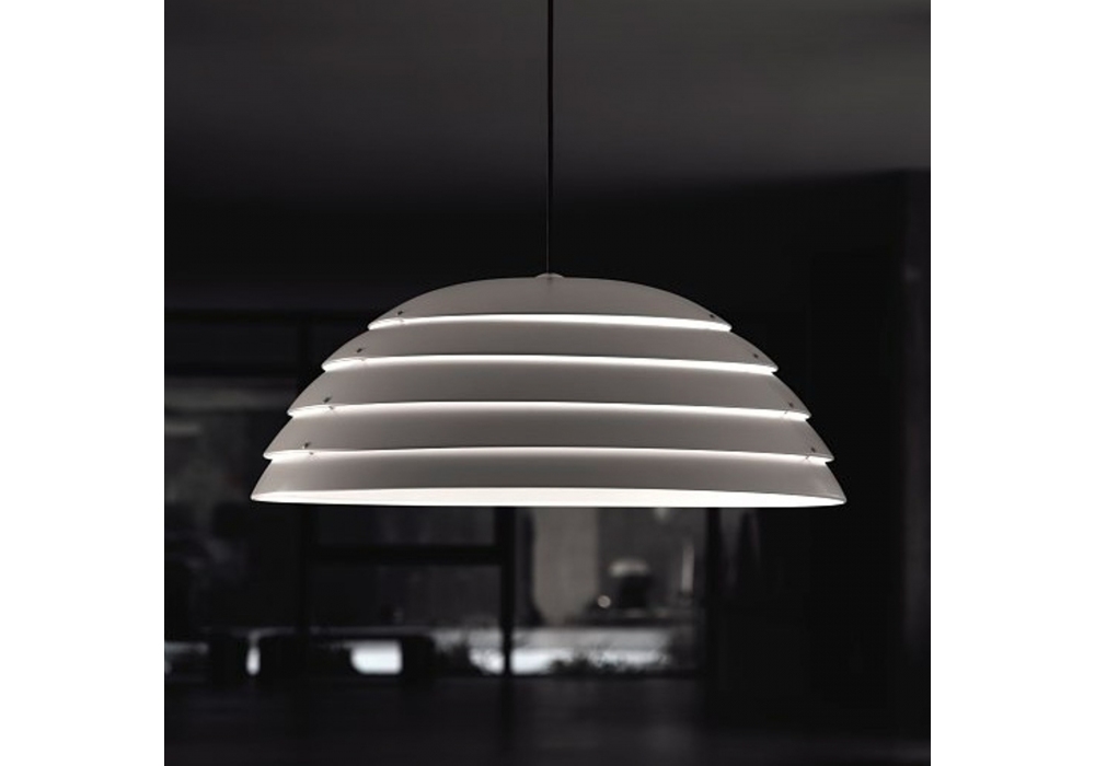 Cupolone diseñada por Elio Martinelli para Martinelli Luce es una lámpara de suspensión enteramente estructurada en aluminio con elementos superpuestos pintados de blanco. La fuente de luz adoptada es de tipo LED.