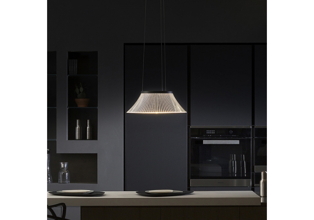 Plissè diseñada por Emiliana Martinelli para Martinelli Luce es una lámpara de suspensión de forma circular con estructura portante en aluminio pintado. El difusor es de metacrilato transparente caracterizado por rótulos gráficos realizados con láser. La fuente de luz adoptada es del tipo LED integrado.