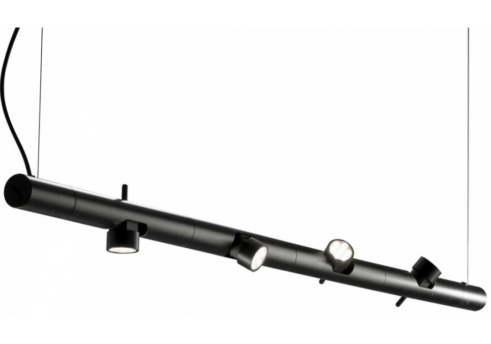 Calabrone spots diseñada por Emiliana Martinelli para Martinelli Luce es una lámpara de suspensión modular en tubo de aluminio pintado de negro. Los focos son orientables y adoptan una fuente de luz LED regulable. Calabrone Sopt está disponible en versiones de 4 u 8.