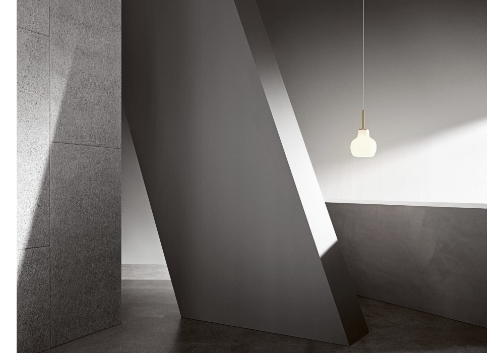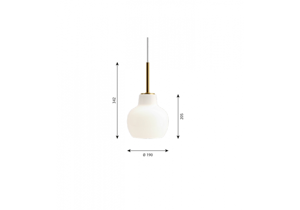 VL Ring Crown 1 diseñada por Vilhelm Lauritzen para Louis Poulsen es una lámpara de suspensión con estructura portante en latón sin tratar. El difusor es de vidrio soplado oplaino brillante y protege una fuente de luz LED o halógena con casquillo E27.