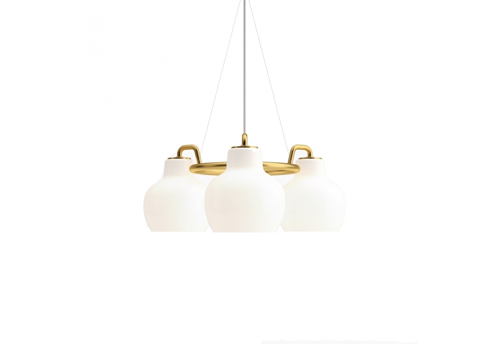 VL Ring Crown 3-5-7 diseñada por Vilhelm Lauritzen para Louis Poulsen es una lámpara de suspensión con estructura portante en latón crudo. Los difusores son de vidrio soplado oplaino brillo y apantallan una fuente de luz LED o halógena con casquillo E27. VL Ring Crown 3-5-7 está disponible con 3,5 o 7 puntos de luz.