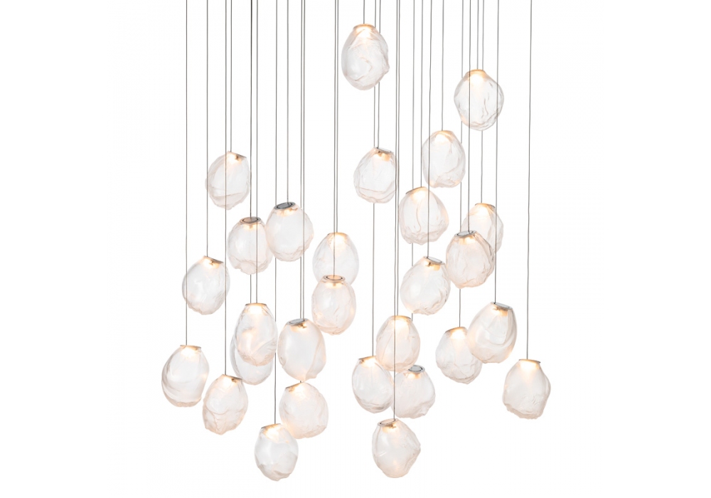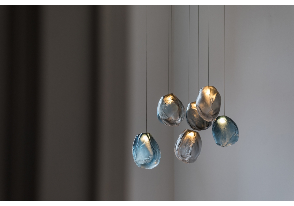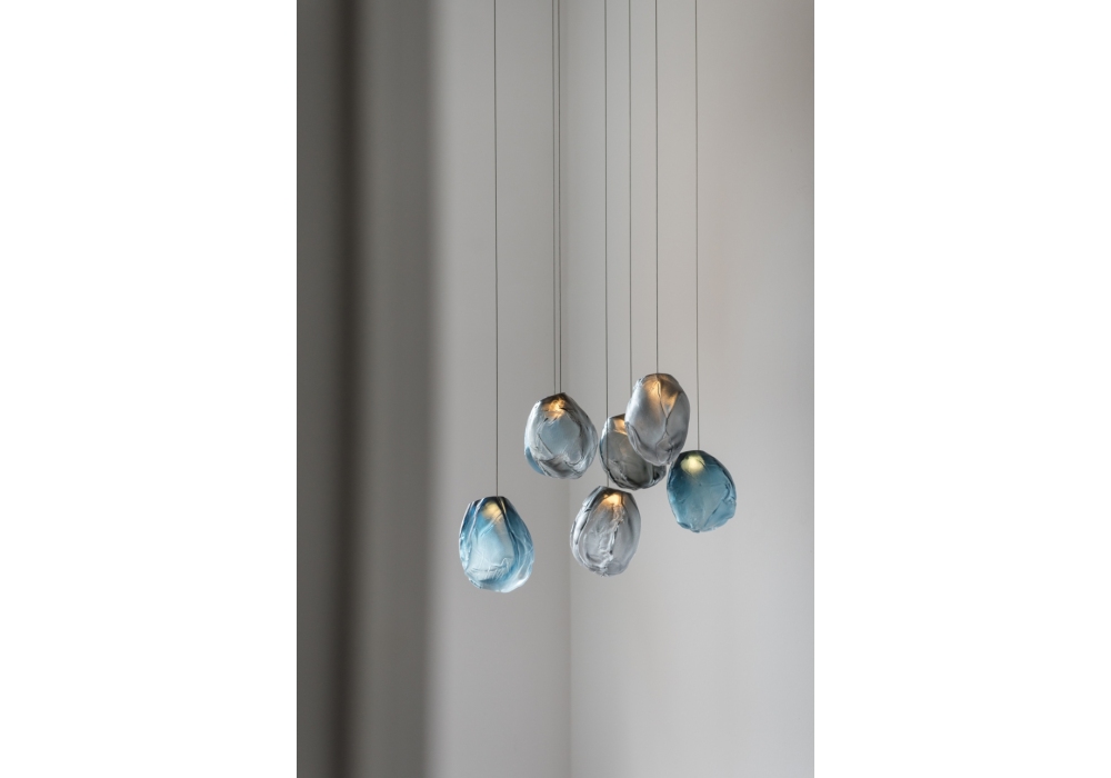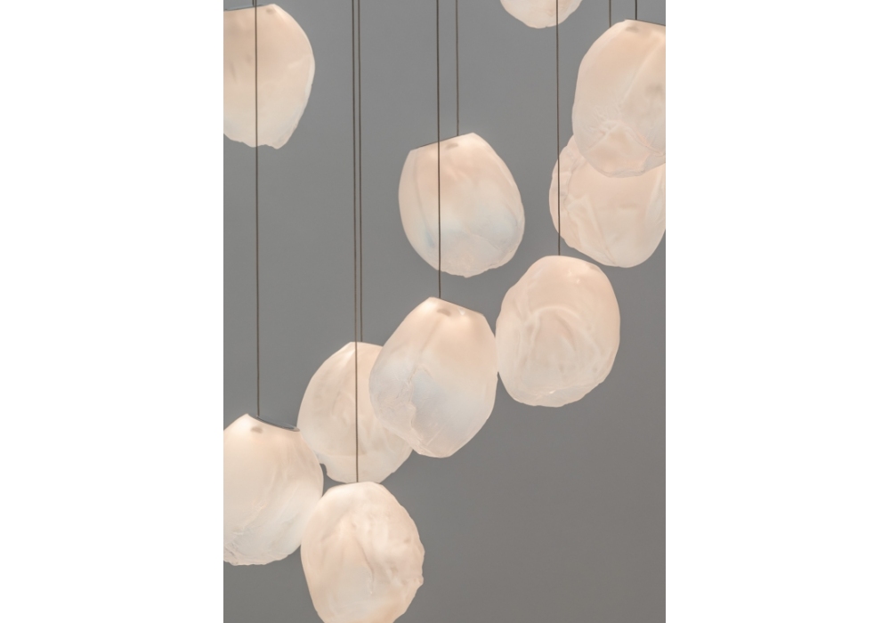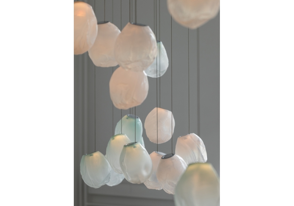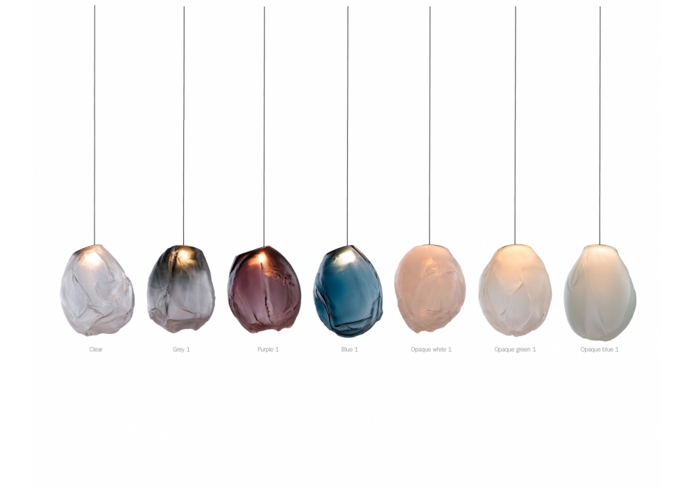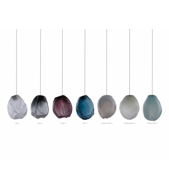 73 es la serie de lámparas de suspensión diseñada por Omer Arbel para Bocci. Se obtiene soplando el vidrio líquido dentro de un jarrón irregular de fibra cerámica resistente a altas temperaturas. La forma que se obtiene de vez en cuando recuerda estructuralmente la textura de una tela que se vuelve definitiva cuando se enfría. Se coloca un LED delgado de tal manera que llene todo el volumen con luz difusa para acentuar la percepción volumétrica de la pieza. En virtud de la fabricación, cada lámpara es única en su especificidad. La serie 73 fue concebida para crear sofisticadas composiciones que recuerdan a las nubes. Disponible en diferentes versiones.