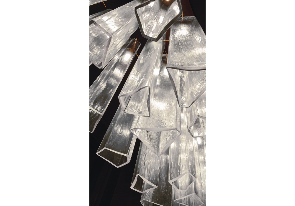 Airlight diseñada por Massimo Castagna para Henge es una lámpara colgante compuesta por estructura de metal y varillas poliédricas en vidrio de Murano transparente o gris. Disponible en diferentes composiciones.