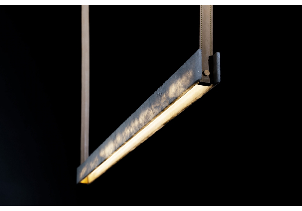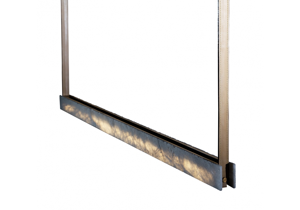 Chrystal Evo diseñada por Massimo Castagna para Henge es una lámpara modular con cuerpo en piedra White Chrystal. Suspensión y fuente de alimentación revestidos con tira de cuero de 4,5 cm color burdeos, natural o negro bajo pedido. Está disponible en versión blanco cálido (3000K) o blanco extra cálido (2700K).