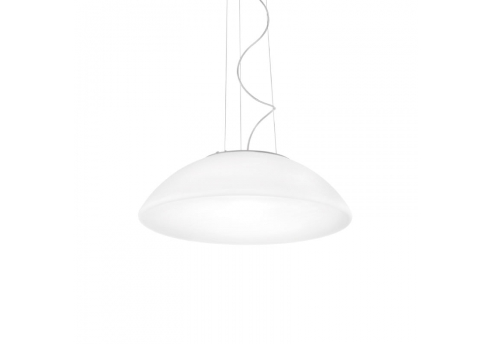 Infinita diseñada por Toso, Noti Massari & Associati para Vistosi es una lámpara de suspensión con estructura portante en metal blanco brillante. El difusor es de cristal circular con acabado blanco/satinado y adopta una fuente de luz regulable halógena o LED con casquillo E27. Infinita está disponible en diferentes modelos.