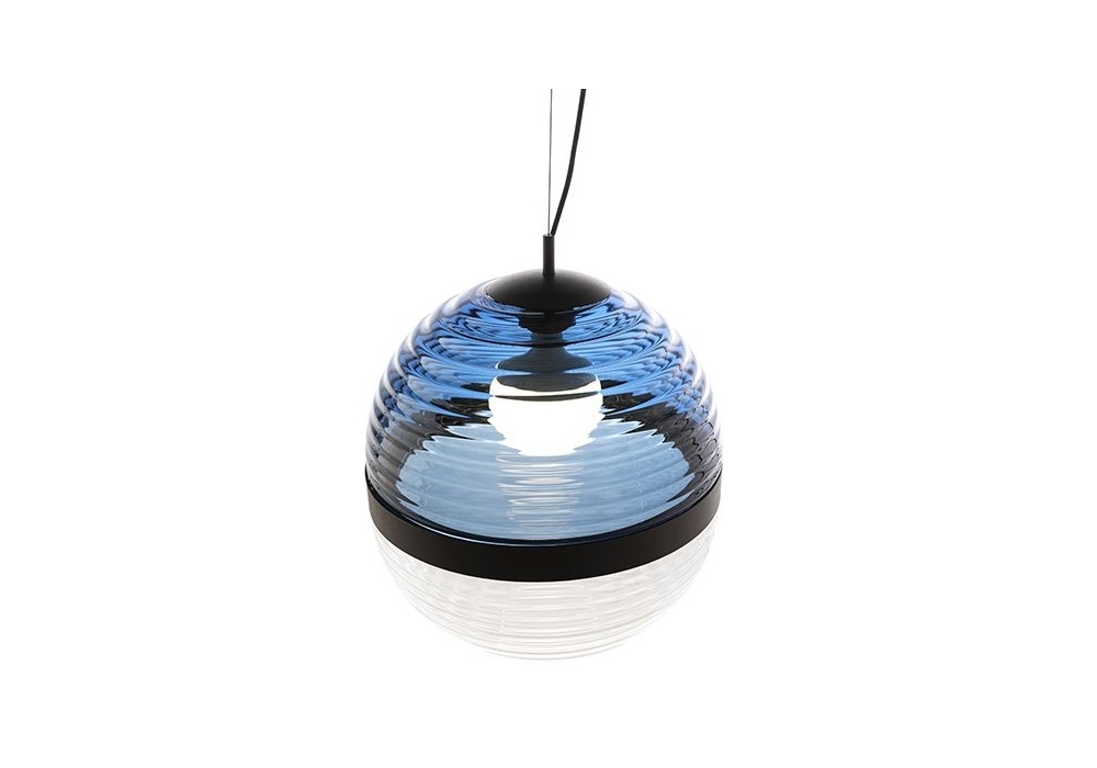 Cord Lamp diseñada por Werner Aisslinger para Cappellini es una lámpara de suspensión realizada con difusor compuesto por dos tapas de vidrio rayadas y partes en metal pintado de negro. La parte inferior es siempre transparente y la parte superior en vidrio coloreado. Disponible en diferentes acabados y dimensiones.