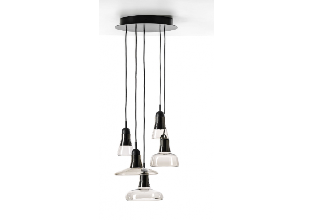 Shadows Set Ring diseñada por Koldova Dan Yeffet para Brokis es una lámpara de suspensión con difusores de vidrio soplado en varios acabados brillantes o con una superficie exterior grabada al ácido, que protegen una fuente de luz LED regulable. Florón de techo de metal con recubrimiento en polvo en blanco o negro mate. Cable de alimentación de fibra textil en varios colores.