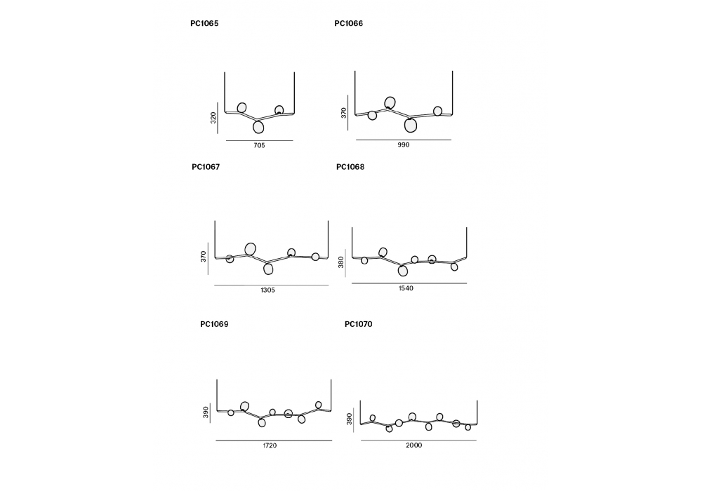 | Dimensiones | PC1065_ 70,5 x H 32 cm; PC1066_ 99 x H 37 cm; PC1067_ 130,5 x H 37 cm; PC1068_ 154 x H 38 cm; PC1069_ 172 x H 39 cm; PC1070_ 200 x H 39 cm. |
