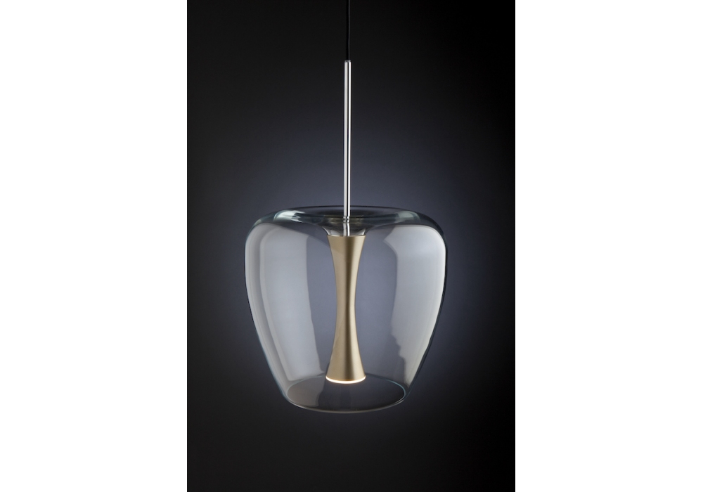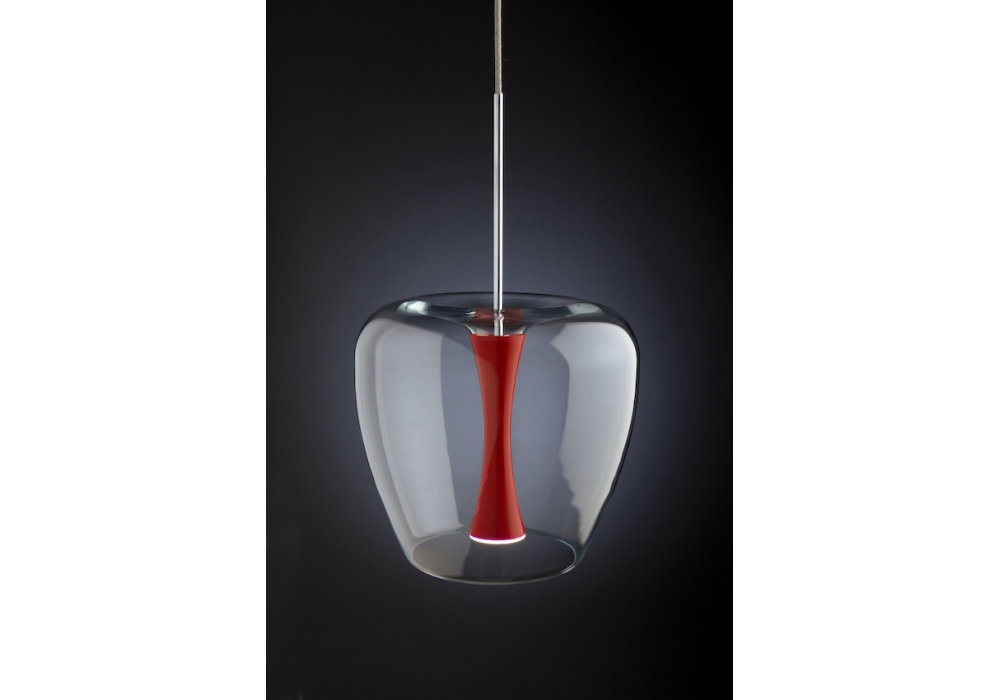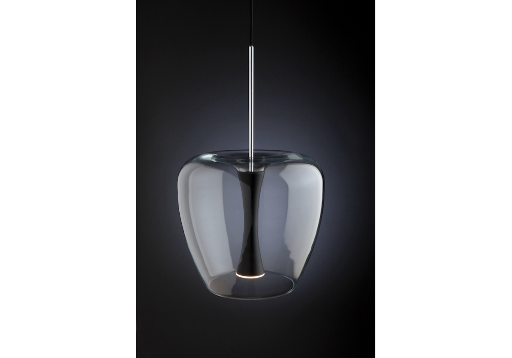 Apple Mood Small diseñada por Malika Novi para Quasar es una lámpara de suspensión con rosetón circular negro con placa cromada y cuerpo circular de vidrio y núcleo central de aluminio pintado. La fuente de luz es de tipo LED regulable, con cable de alimentación de fibra textil de color negro. Apple Mood Small está disponible en diferentes acabados y con drivers y candados de cable incluidos.