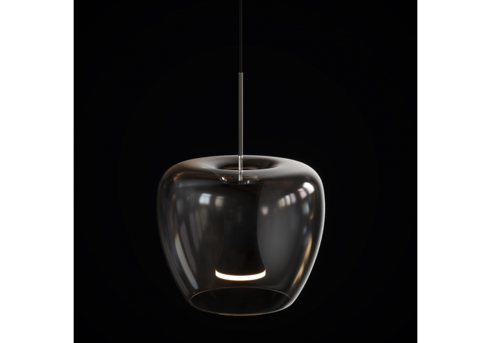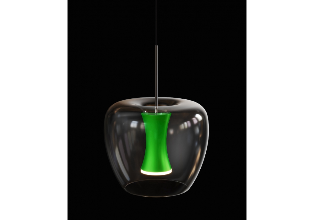 Apple Mood diseñada por Malika Novi para Quasar es una lámpara de suspensión con cuerpo circular de vidrio y núcleo de aluminio pintado en diferentes acabados. La fuente de luz es de tipo LED regulable, con cable de alimentación de fibra textil de color negro y rosetón circular negro con placa cromada.