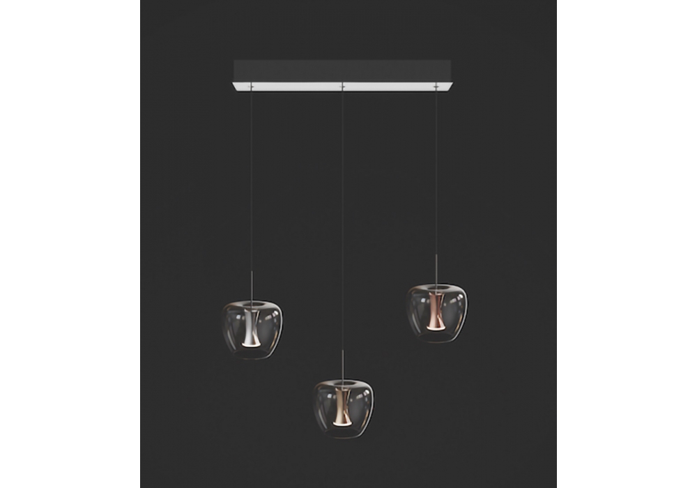 Apple Mood 3 diseñada por Malika Novi para Quasar es una lámpara de suspensión con rosetón cuadrangular en metal pintado de negro y placa cromada. Las lámparas tienen forma circular y están fabricadas en cristal, con un núcleo de aluminio pintado en diferentes acabados. Las fuentes de luz adoptadas son del tipo LED regulables con cable de alimentación de fibra textil.