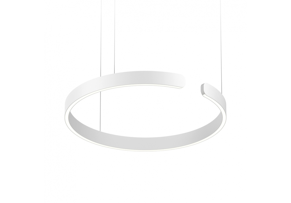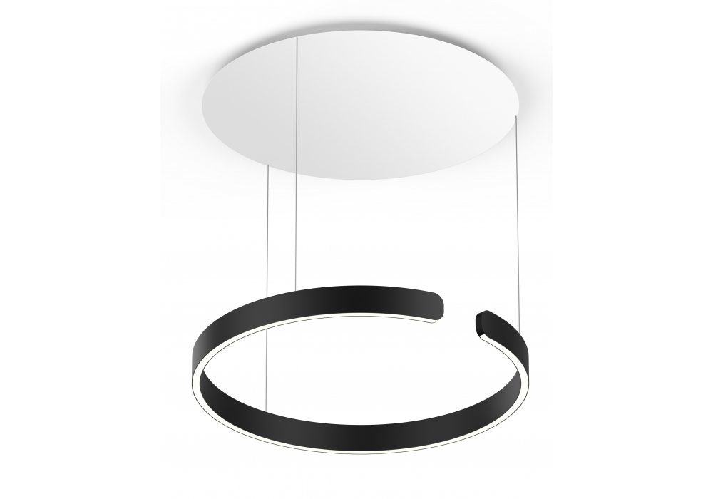 Mito Sospeso 60 diseñada por Occhio es una lámpara de suspensión LED regulable en altura, a través del revolucionario sistema de gestión de gestos "touchless control" es posible calibrar continuamente el color de la luz. Está fabricado en aluminio, acero pintado, revestimiento de PVD, plástico, silicona óptica y fibra de vidrio.