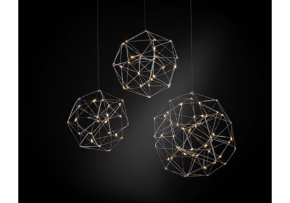 Cosmos Globe diseñada por Jan Pauwels para Quasar es una lámpara de suspensión con un rosetón negro y un cuerpo esférico desestructurado compuesto por una serie de varillas tubulares pintadas ancladas entre sí. Las fuentes de luz fijadas a la estructura son del tipo LED. Cosmos Globe está disponible en diferentes modelos y acabados.